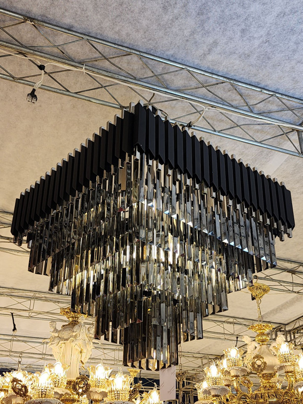 لوستر مدل پروفیل در پروفیل رنگ مشکی نقره ای با کریستال دودی با ابعاد 60در60 مناسب برای پذیرایی .