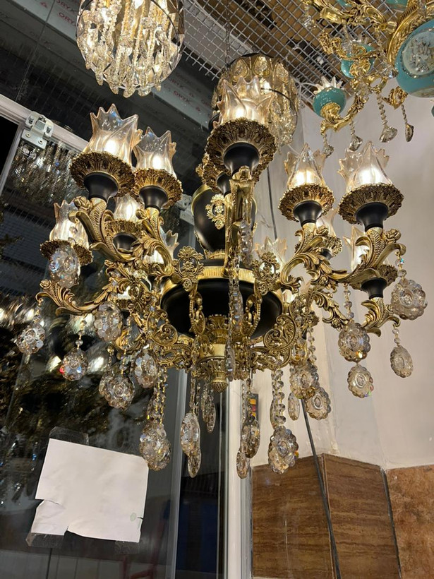لوستر شاه عباسی مدل آرامیس طرح سرامیک رنگ طلایی مشکی با لاله بلند و کریستال سایز 3 دارای 16شعله مناسب برای پذیرایی تا24متر .